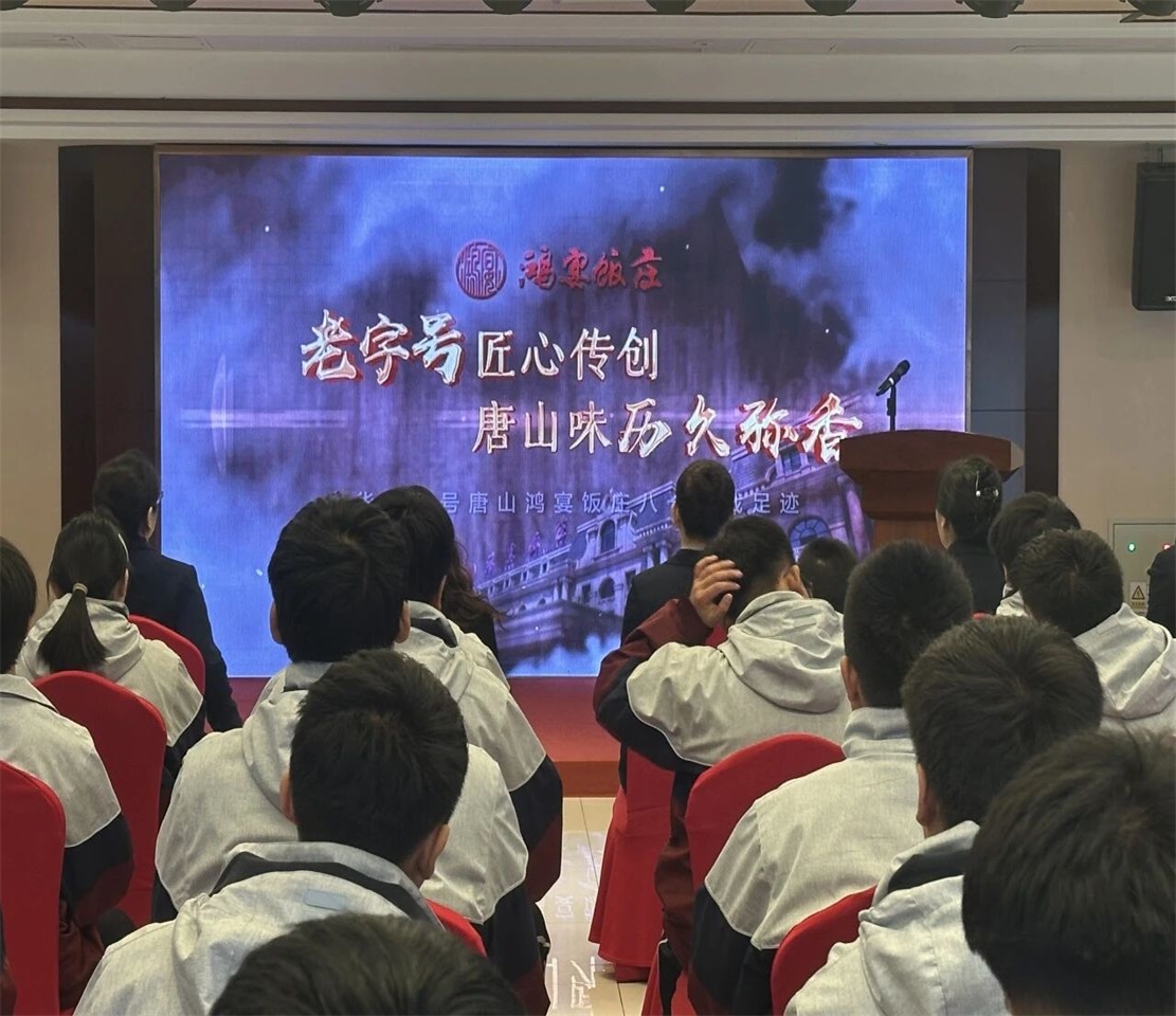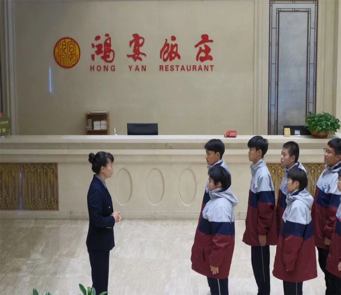 25级中餐鸿宴班学生走进唐山鸿宴饭庄,在企划部经理李照玉的带领下,同学们有序参观了企业展示长廊及核心工作区域。从整洁明亮的门店大厅,到规范有序的后厨操作间,大家近距离直观感受了餐饮行业的高标准服务规范与严格化运营管理要求。