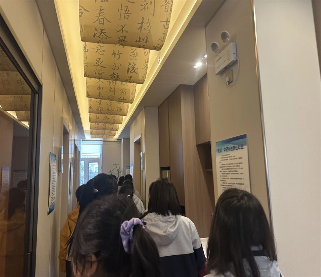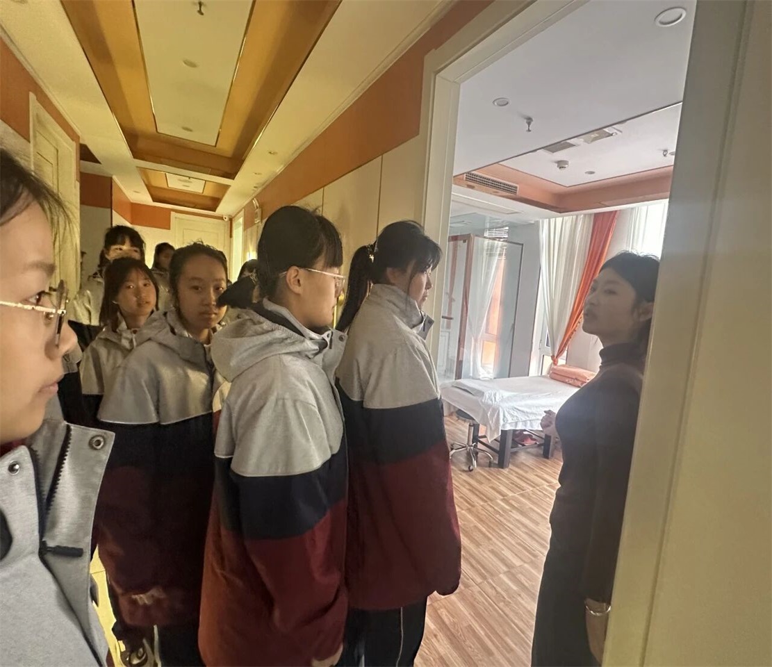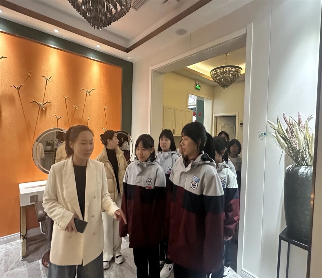在认知实习过程中,学生们依次参观了三家门店,从现代简约的接待大厅到分区明确的服务区域,专业化的环境布局与设备配置让学生直观感受到美业与康养领域的高标准服务流程。