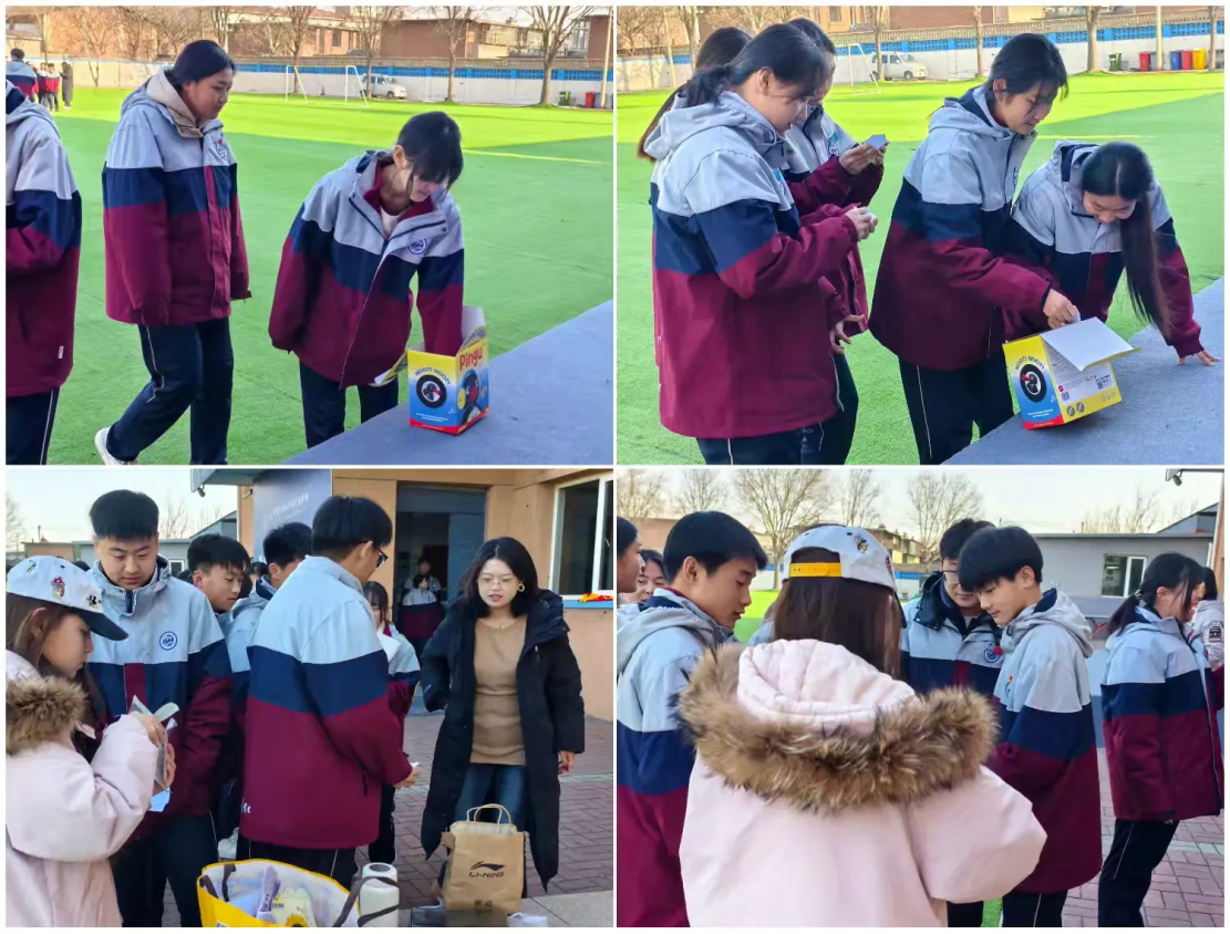 颁奖典礼结束后,抽奖环节正式开始。老师分批宣读抽奖名单,听到名字的同学有序走上台前参与抽奖。抽完奖的同学,移步至旁边的领奖区,等候崔总及旅行社工作人员发放奖品。整个过程分批推进、井然有序,充分展现了同学们良好的行为规范。