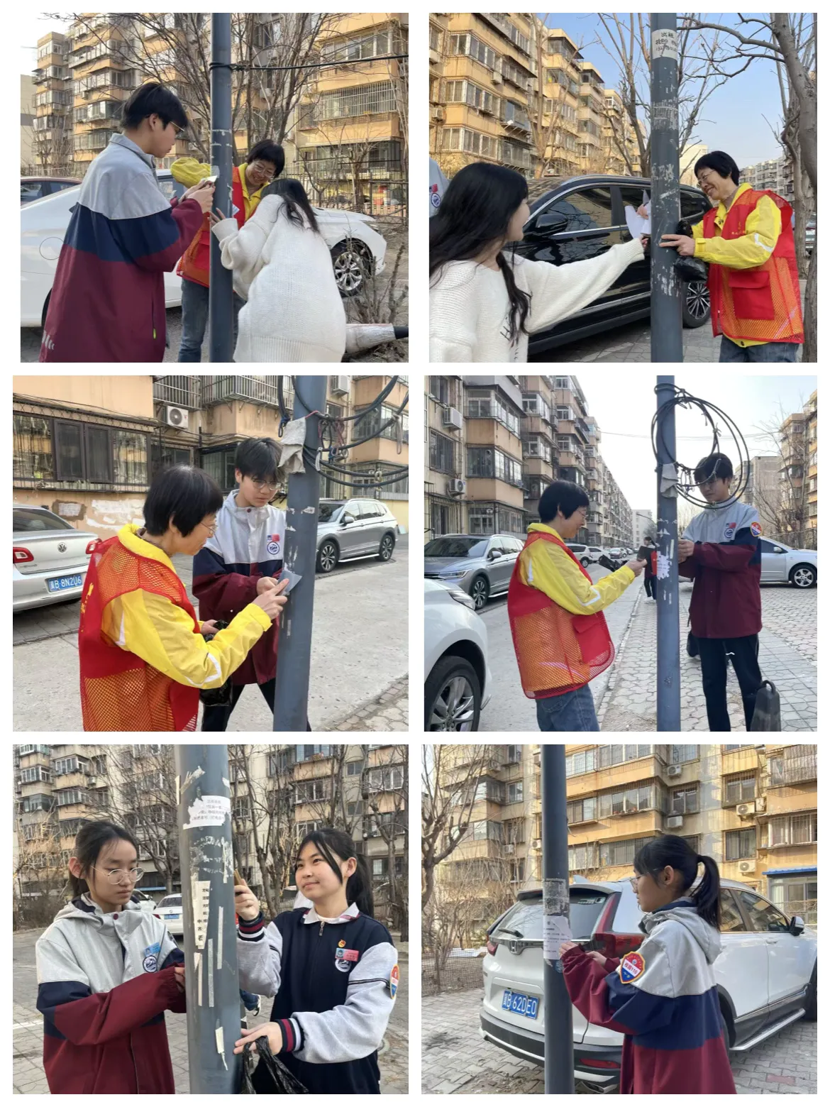 净美护航队由王慧军老师、吕晓坤老师、李丹老师带领,同学们分组开展环境整治志愿服务。分工协作,认真铲除墙面、电线杆上的小广告,仔细捡拾白色垃圾,对公共区域进行全面清理。同学们以实际行动传承雷锋精神,用双手美化家园,让社区环境更加整洁有序。